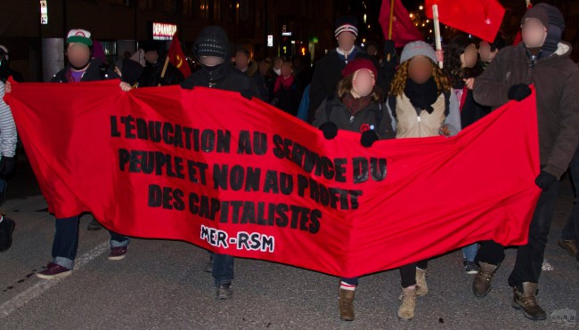 At our last Congress we decided to organize a Pan-Canadian Day of Action against austerity and in solidarity with the student strike in Quebec. This came to fruition on March 24 when 12,000 students in 15 different cities across Canada responded to our call. Actions included a large “night demonstration” in Montreal in support of striking students, as well as an historic “long march” from York to the University of Toronto in support of striking academic workers at both schools. For the first time ever, rather than simply responding to events as they arose, the RSM took the lead and pushed the struggle forward across Canada. This represents an important advance in our influence and practice.