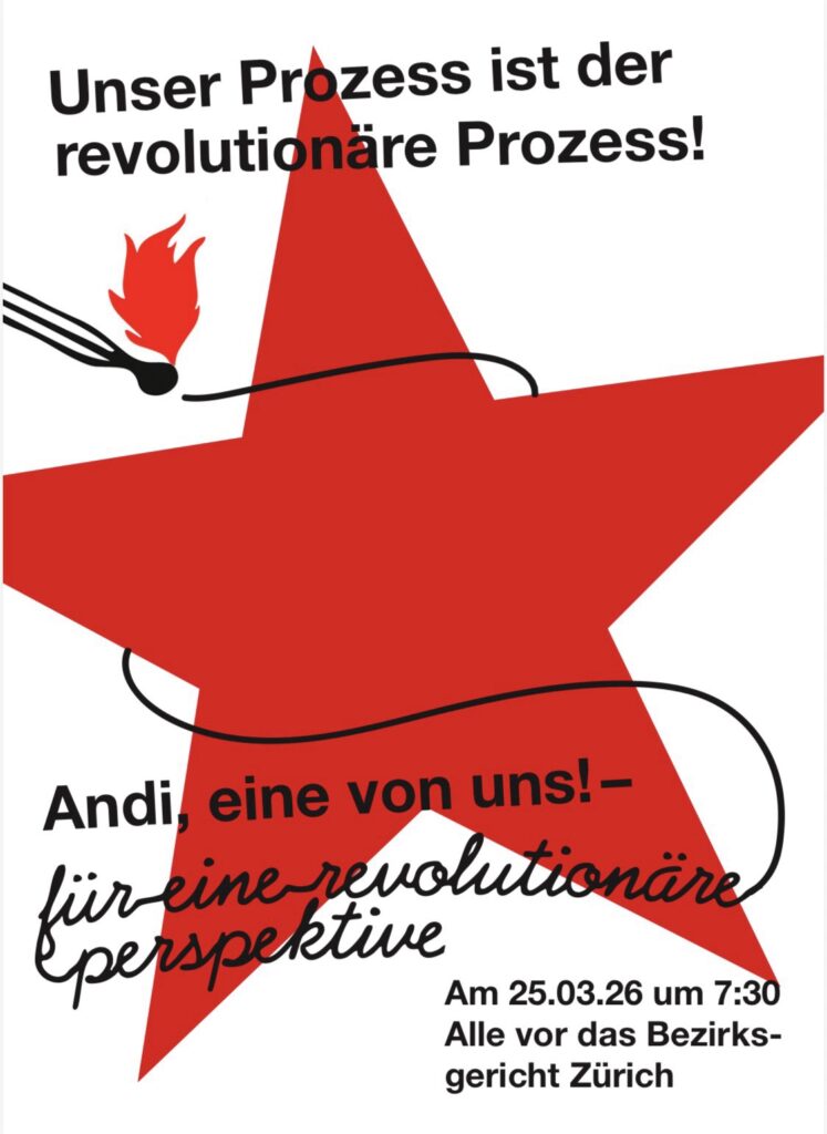 Secrétaire du Secours Rouge International, la militante Andi doit comparaître le 25 mars 2026 devant le tribunal de district de Zurich pour sa participation présumée à deux manifestations : la mobilisation antifasciste « Züri Nazifrei » du 12 février 2022 et une manifestation révolutionnaire pour le climat organisée à Bâle le 11 février 2023. Ses soutiens appellent à se mobiliser pour la soutenir, mais aussi en y défendant une perspective révolutionnaire.