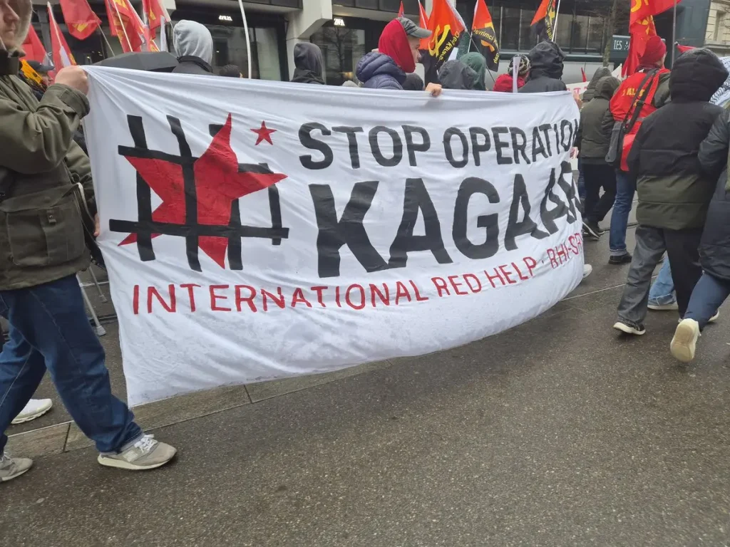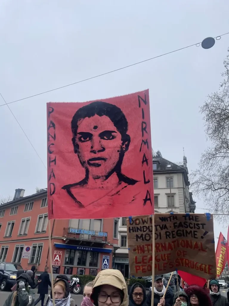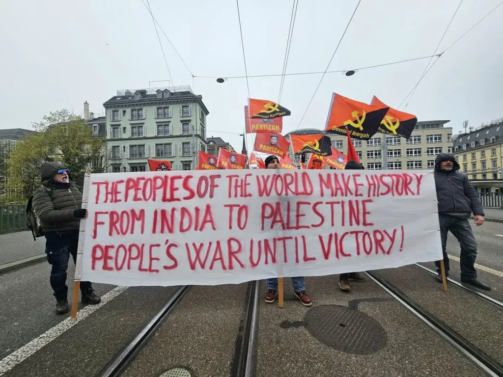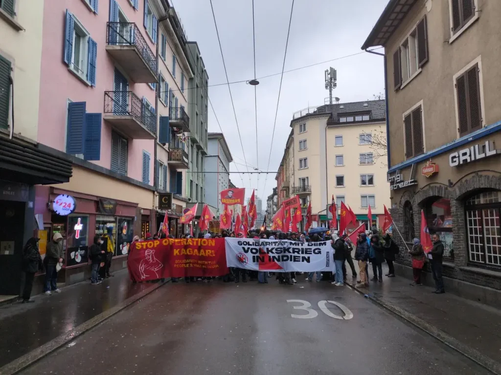 Following a call from the Urgent Campaign Committee Against Operation Kagaar, a demonstration was held on March 28th in Zurich, Switzerland, demanding an end to the attacks carried out by the Indian government. The demonstration began with a solidarity march for Palestine, followed by a procession emphasizing solidarity with Indian revolutionaries. Participants carried photographs of leaders of the Communist Party of India (Maoist) and the People’s Liberation Army, condemning the massacres perpetrated against this movement and the operations targeting the Adivasi people.